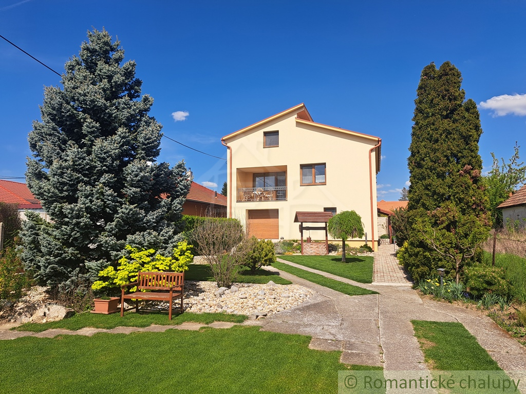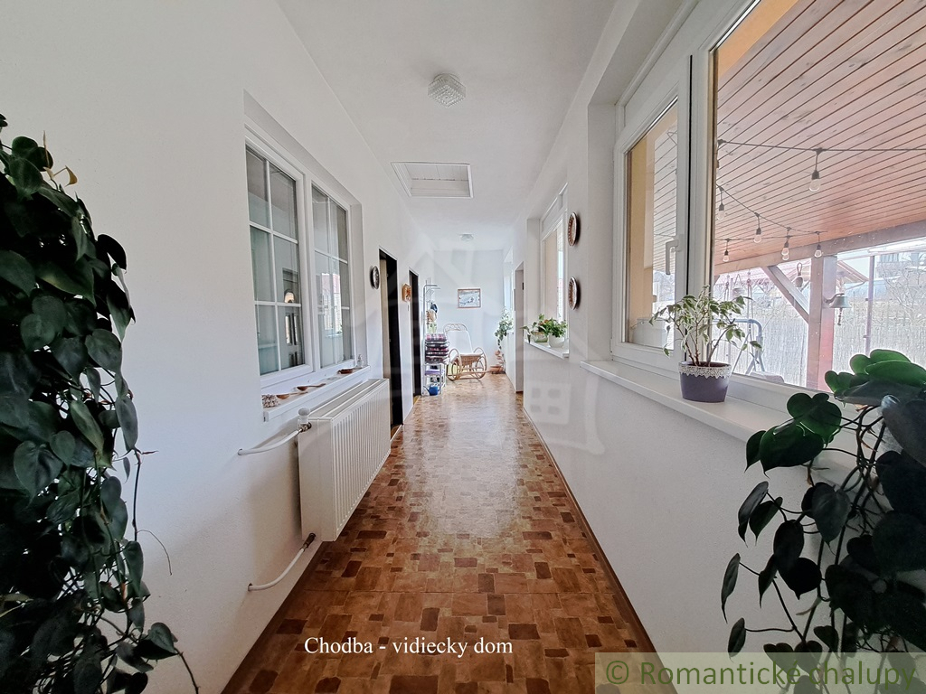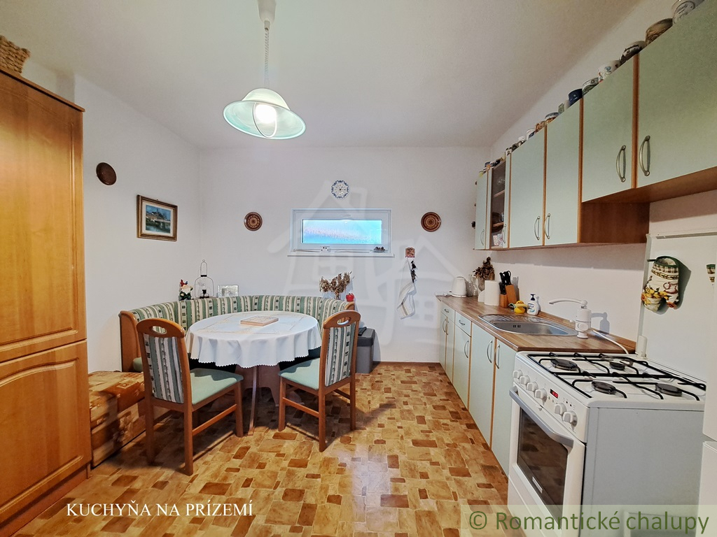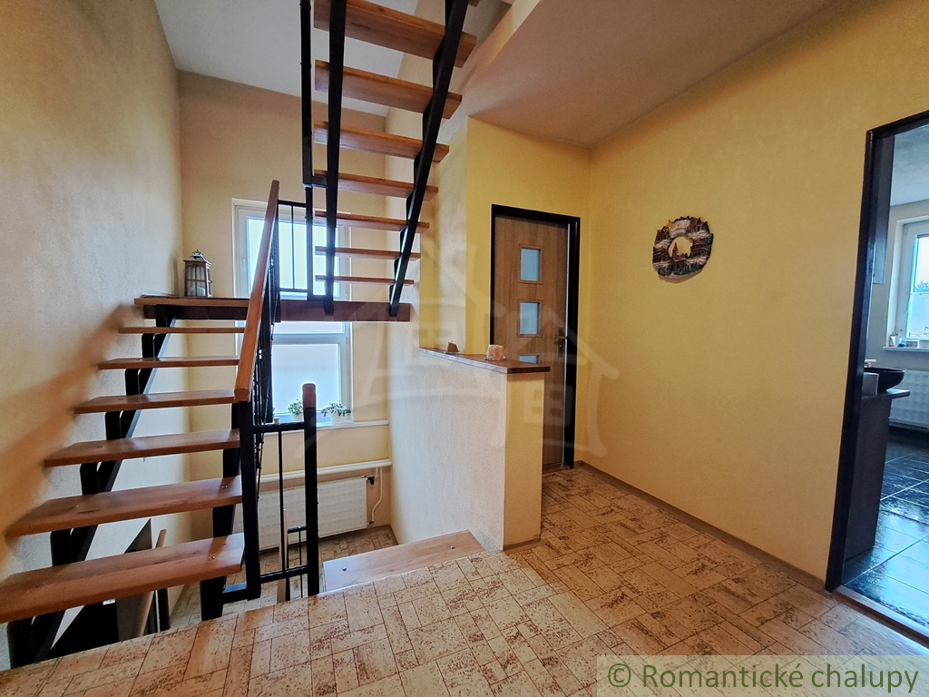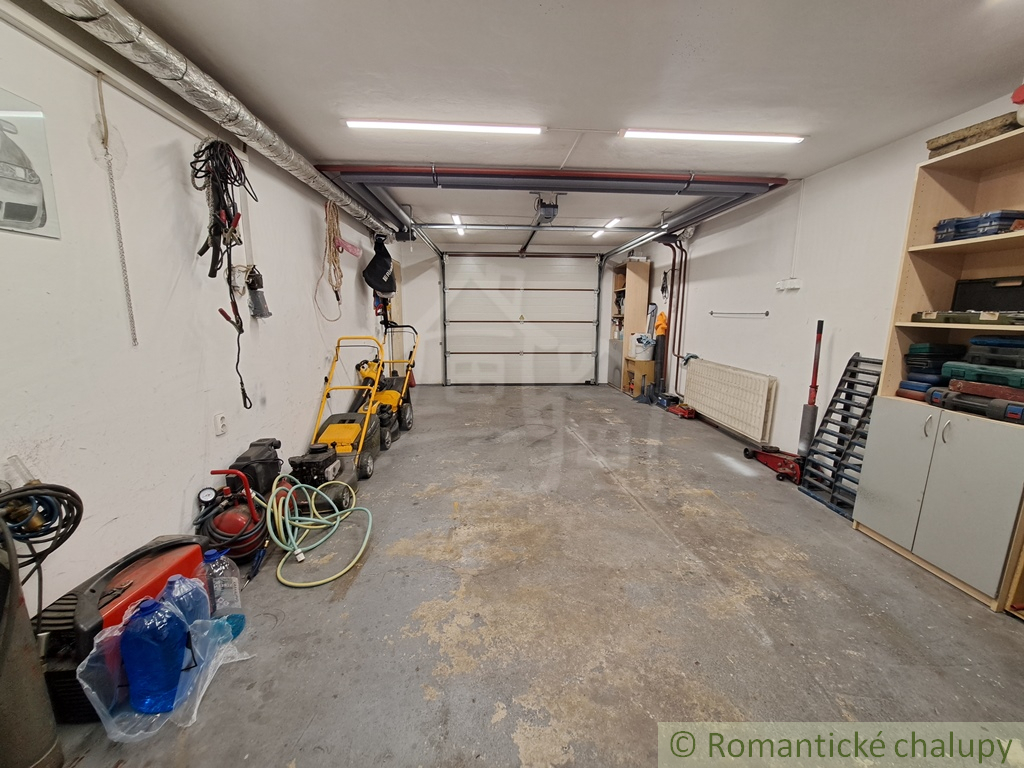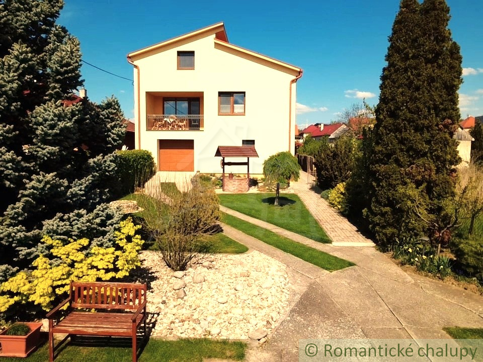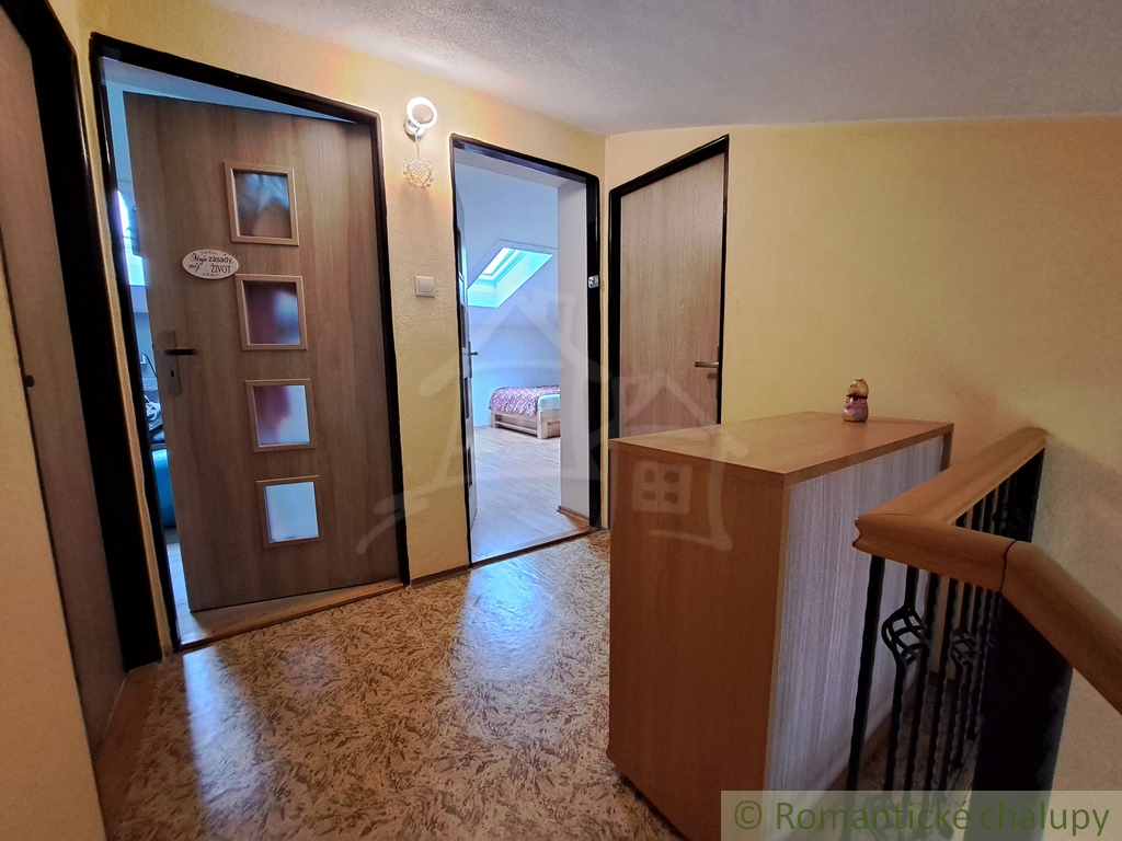 Rodinný dom disponuje prízemím a dvoma podlažiami. Prízemie pozostáva z hlavnej priestrannej vstupnej haly, pracovne, práčovne s toaletou, veľkej garáže s elektrickou bránou a kotolne. Zo vstupnej haly sa dostanete do časti menšieho vidieckeho domčeka, ktorý disponuje dlhou chodbou s vlastným vchodom, izbou ktorá slúži ako domáce fitness a kuchyňou. Počas letného obdobia môže slúžiť ako letná kuchyňa. Prvé podlažie ponúka veľkú obývačku s balkónom, kuchyňu so špajzou, spálňu a kúpeľňu s toaletou. Ďalšie dve izby sa nachádzajú na druhom podlaží. Veľkou výhodou sú podkrovné priestory, ktoré slúžia ako úložisko. Okná na podkrovných izbách sú vybavené žalúziami na elektrické ovládanie. Interiér domu pôsobí veľmi príjemne a ponúka okamžité bývanie s možnosťou neskoršej modernizácie linolea v dome na podlahovú krytinu alebo dlažbu. V kuchyni, v špajzi a kúpeľni je uložená dlažba.